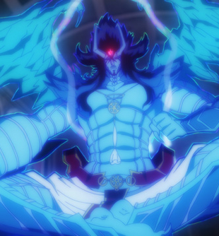 Unlike the Persona version, his version of Baal is more dragon than demon, of a blue, gold, and black palette. His elemental strength is Zio, and is weak to Psi attacks, having a mix of single-target but extremely powerful lightning attacks and a variety of physical attacks, trading the ranged light attacks for the more in-one's face physical attacks. It represents both his wrath at the injustice of the world and his desire to right wrongs like a hero.
